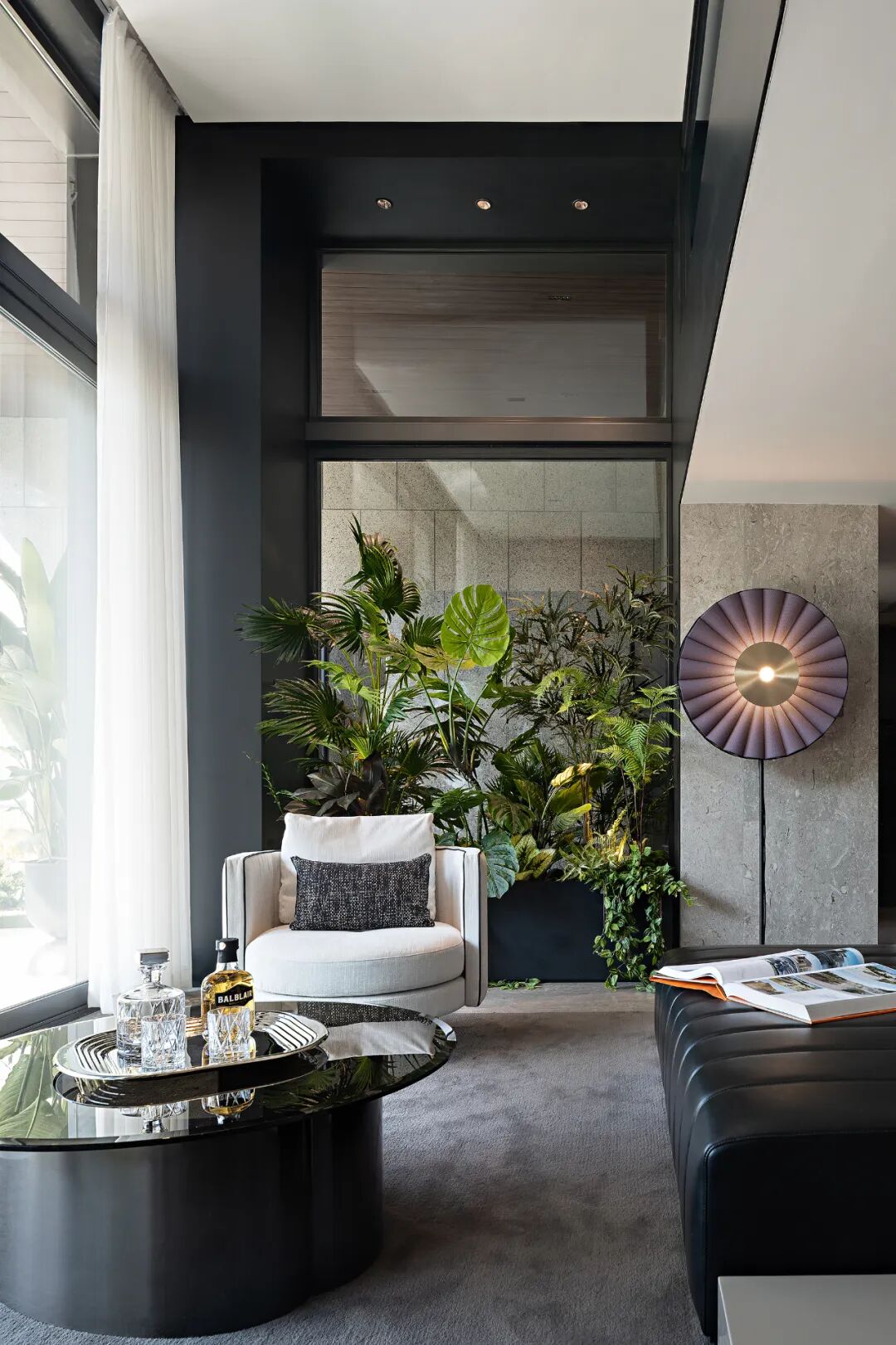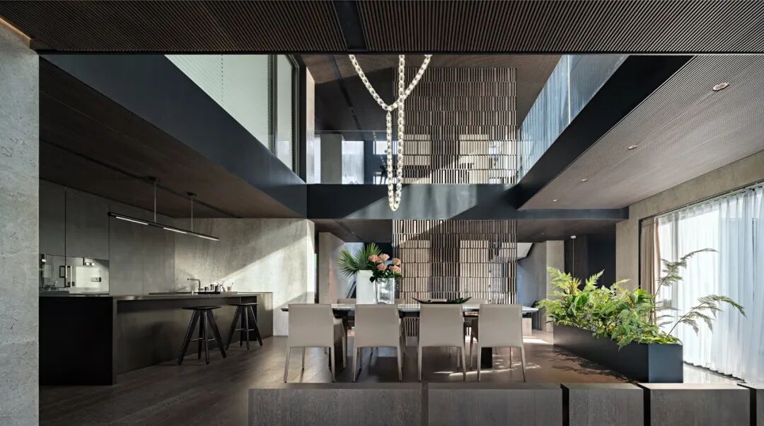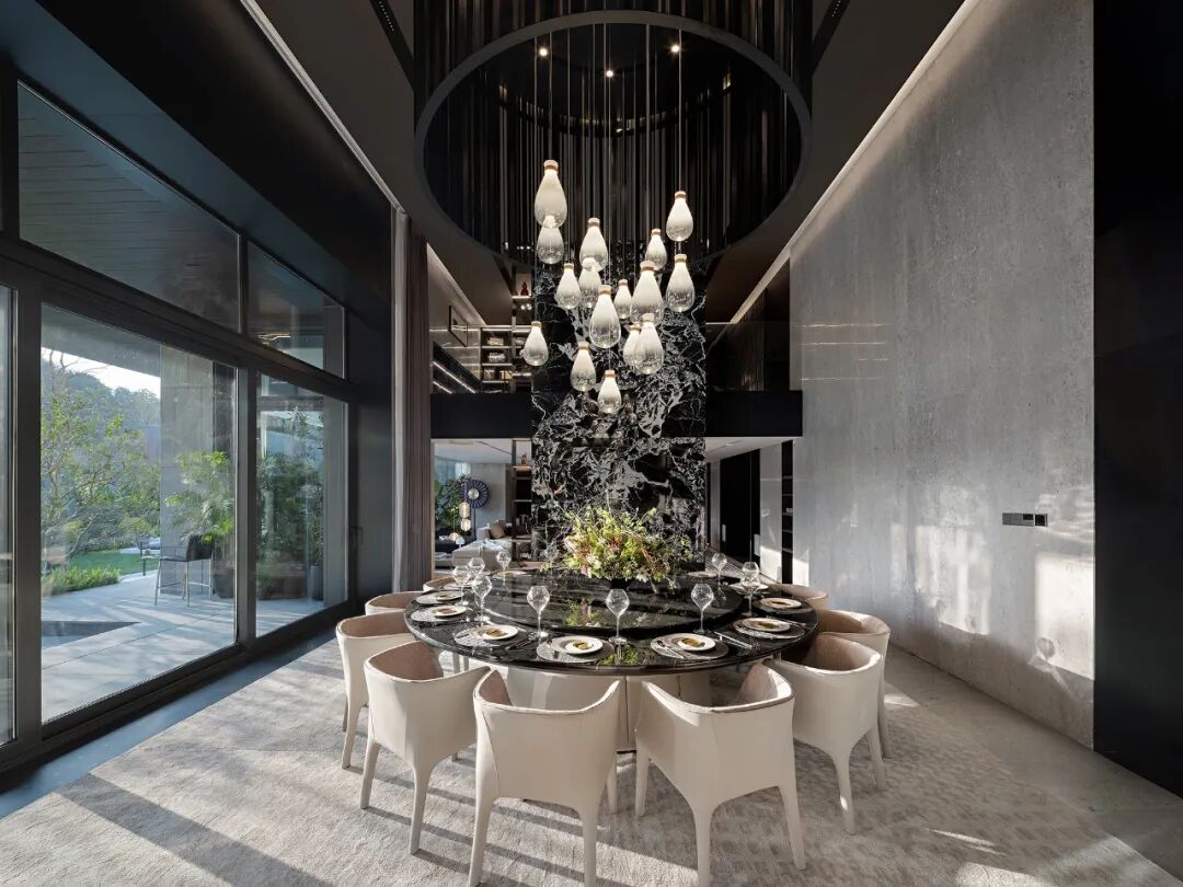 “水之墅”共5层,其中1楼挑高约6米,带夹层,如此开阔的大宅尺度,如此立体的纵深结构,为设计师后续的生活构景和艺术布设留下了自由的可能性。“如何在功能之外,构建出能触达居者内心期许的生活场景,是我们的深度追问。最终以设计来回应追问,解答自然、艺术与生活的共生关系,在精神的契合中达至格局的共鸣。”