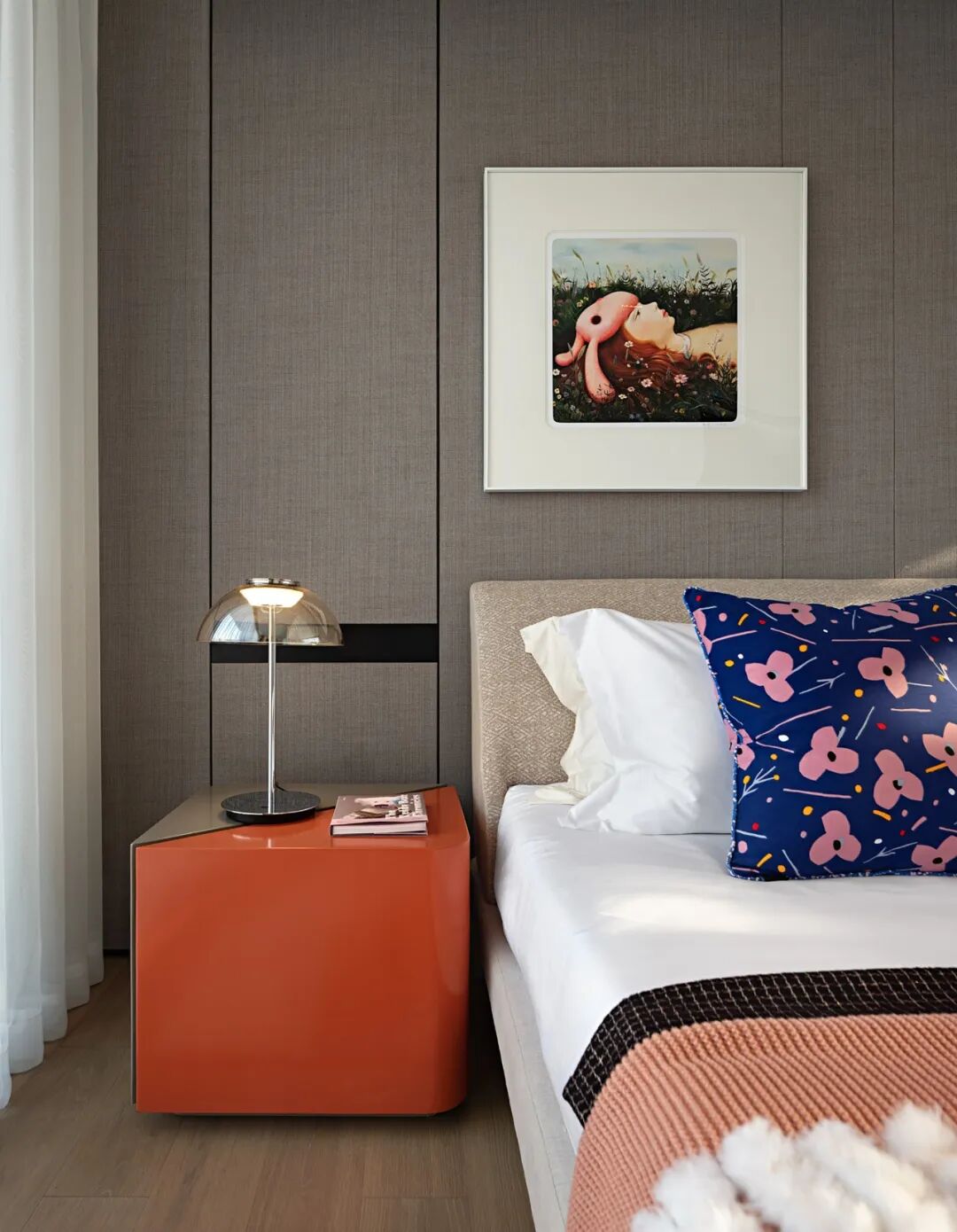 “艺术从生活中来,是一种触手可及的美学温度,同时艺术是有锋芒的,我们希望借由艺术构建生活与诗意之间的桥梁,桥接居者的气场和日常的仪式感。”艺术顾问Simon如是道。木艺为帘,在主卧空间的休憩与休闲之间划下了分隔符,隔而不断的是空间的温情,以及若隐若现的艺术意境。