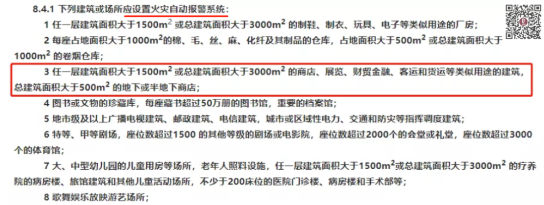 同理,依据《建筑设计防火规范》第8.4.1-3条,单层大于1500㎡或总面积大于3000㎡的商业服务网点也应设火灾自动报警系统。