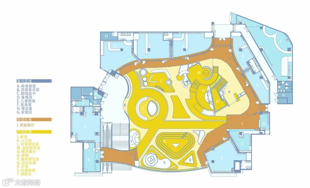 首先是为户外可进行的活动想象了很多的使用场景:运动活动、手工美术课程、户外演出、家校开放日活动、社区开放日活动、夜晚星空派对、儿童美食节、儿童艺术节...等等,可以简化为三个类型:1.户外运动类2.户外课程类3.户外节庆类,但我们并不打算将这个场地的面积直接分为三个区域,因为这会导致每个区域都没有充裕的空间来承载各自的任务,因此我们将这三者功能融合在一起。