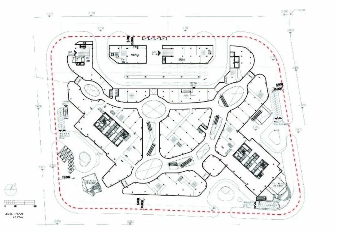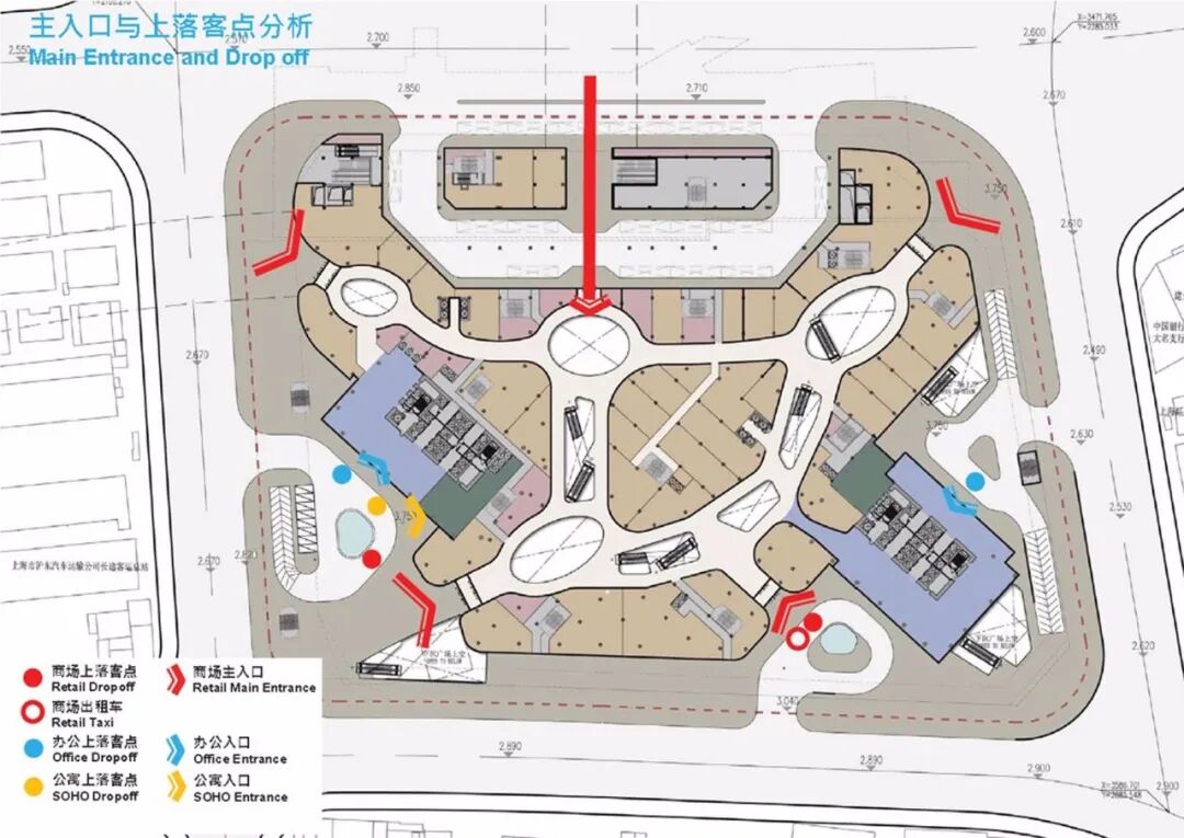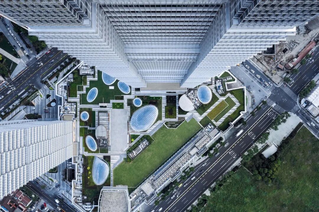 其商业裙房为沪上最大的商场之一,与拥有高效灵活的办公空间的双子塔共同构成功能完备的综合体包括世界级的购物中心、餐厅、溜冰场、电影院和IMAX影院;绿意盎然的公共屋顶花园汇入通达的交通流线,熙熙攘攘的购物胜地成为了周边社区和市民汇集的中心。停车场位于较低的三层,有1600个停车位。