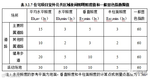 3.2.7 住宅项目室外公共区域夜间照明照度值和一般显色指数不应低于表3.2.7规定的限值。