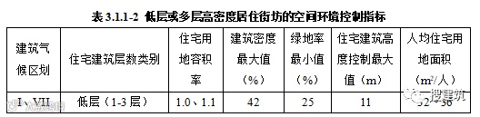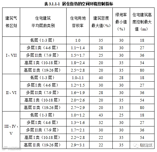 3.1.1 住宅项目应为居民提供宜居的居住生活环境,其居住街坊的空间环境控制指标应符合表3.1.1-1的规定;当住宅建筑采用低层或多层高密度布局方式时,其居住街坊的空间环境控制指标应符合表3.1.1-2的规定。