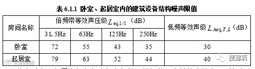 6.1.1 住宅建筑内电梯、水泵、变压器等共用设施设备排放至卧室、起居室内的建筑设备结构噪声,不应大于表6.1.1规定的限值。