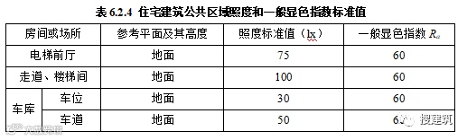 6.2.4 住宅建筑公共区域的照度和一般显色指数不应低于表6.2.4规定的标准值。
