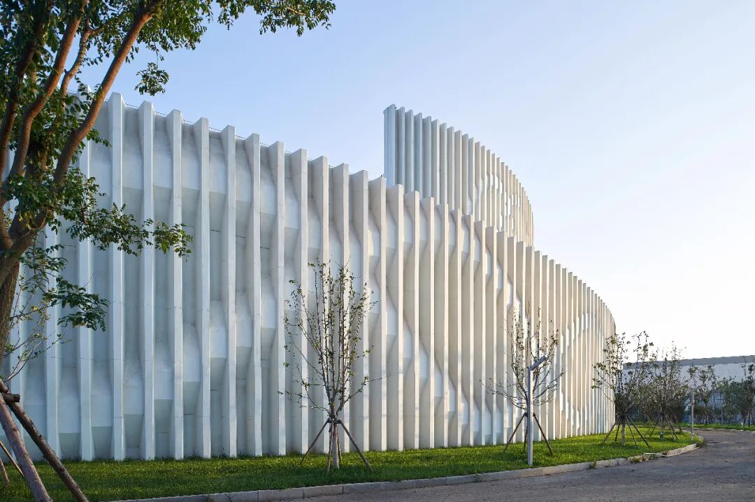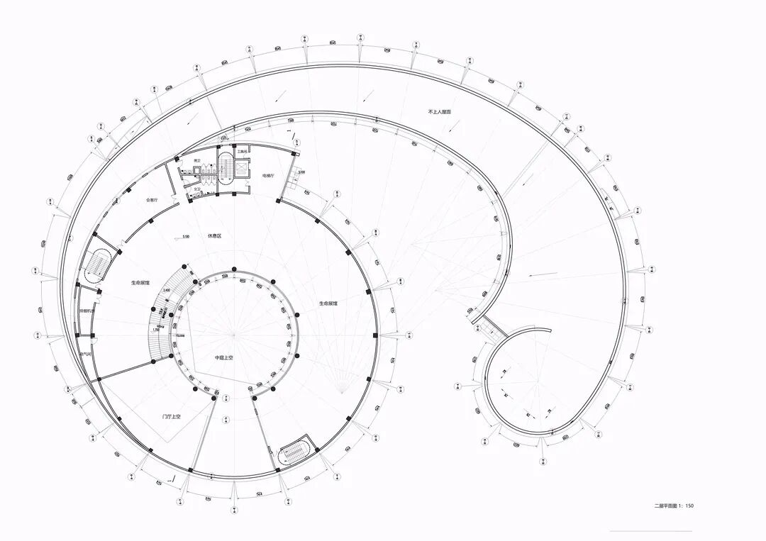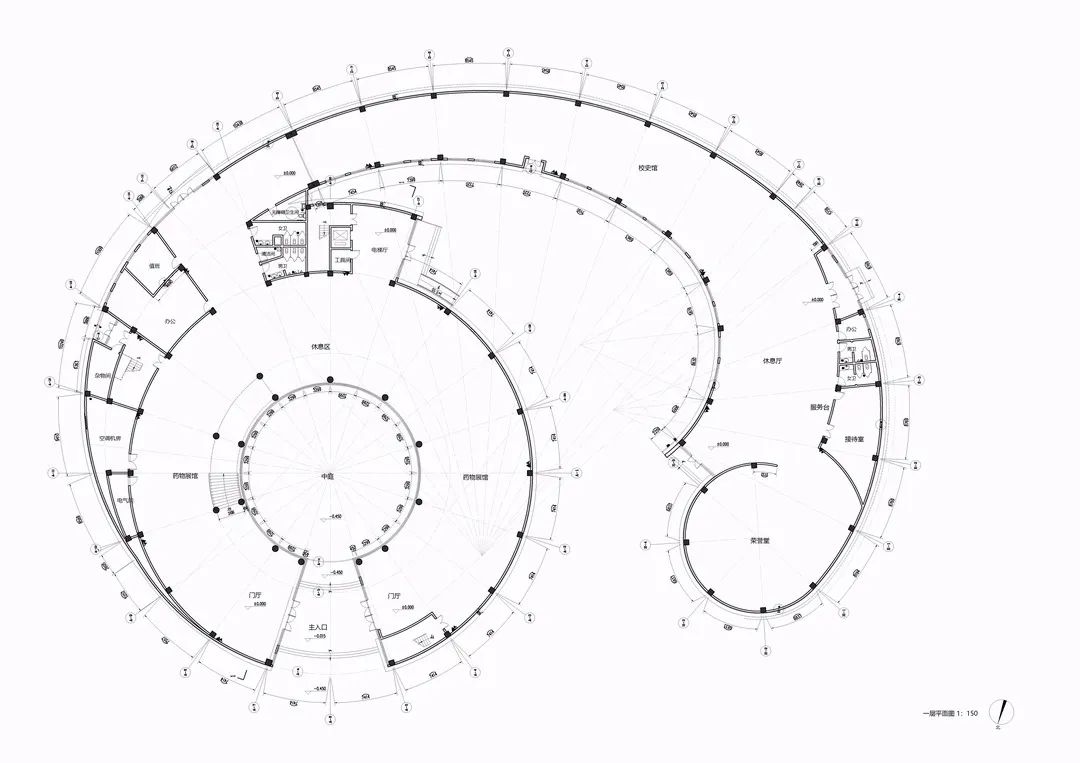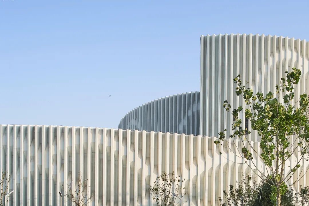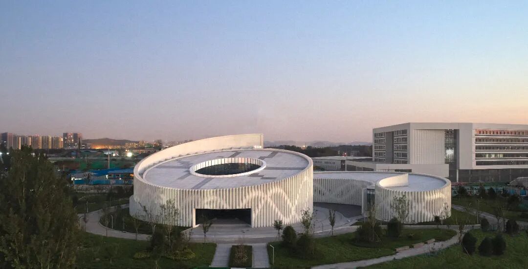 山东第一医科大学医学博物馆呈现一种简单、静谧,形式内向而又富有活力和动感的建筑意向。它欢迎人们进入、感受生命的神奇。高低起伏、螺旋向上的层次感带来丰富的空间感受,同时这种向上的状态似乎在传达生命积极向上的姿态、讲述生命的力量。同时,曲线的建筑姿态呈现一种柔美的空间形态,与螺旋向上的建筑立面相结合。我们希望传达的是生命的柔与刚、静与动、矛盾与和谐。