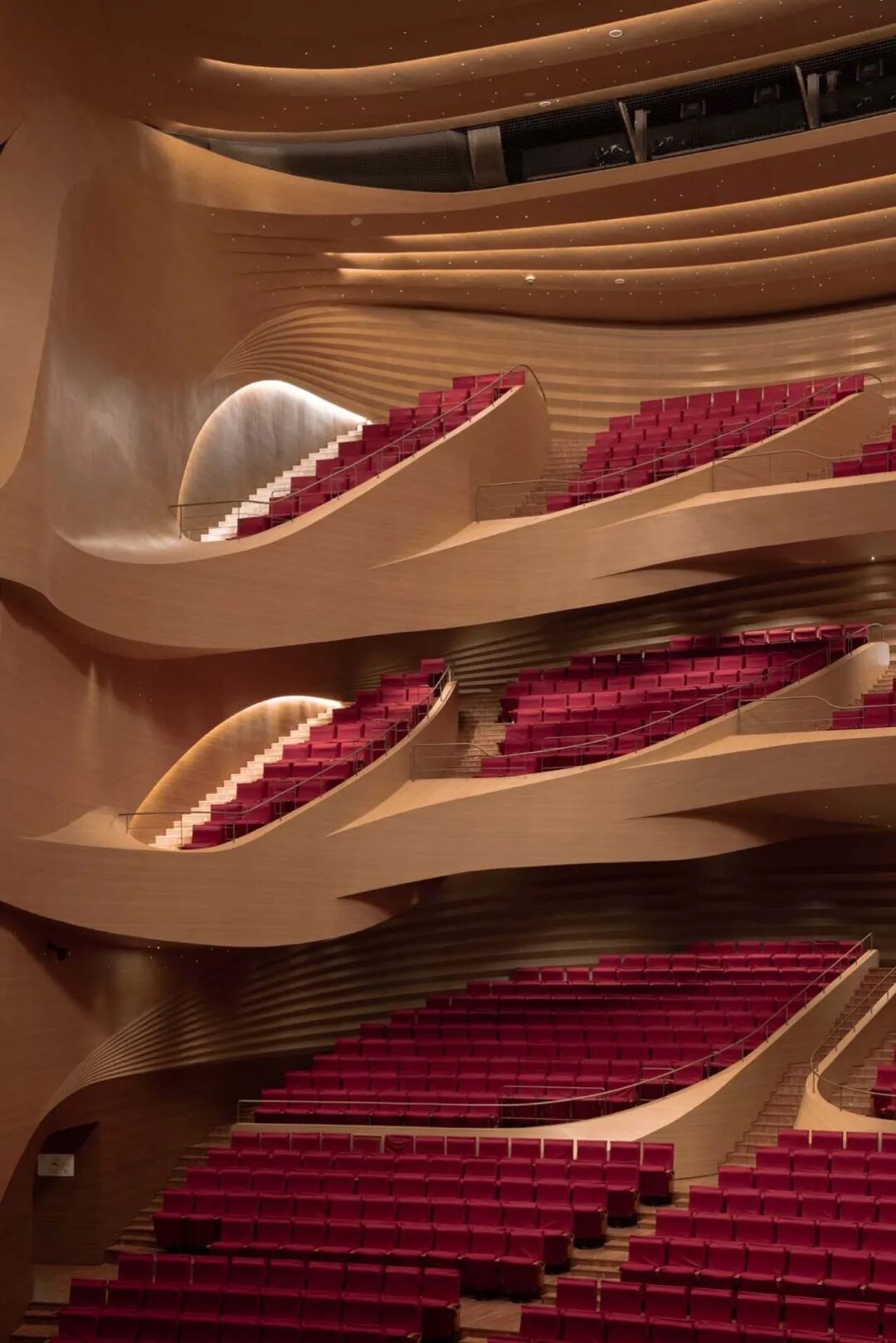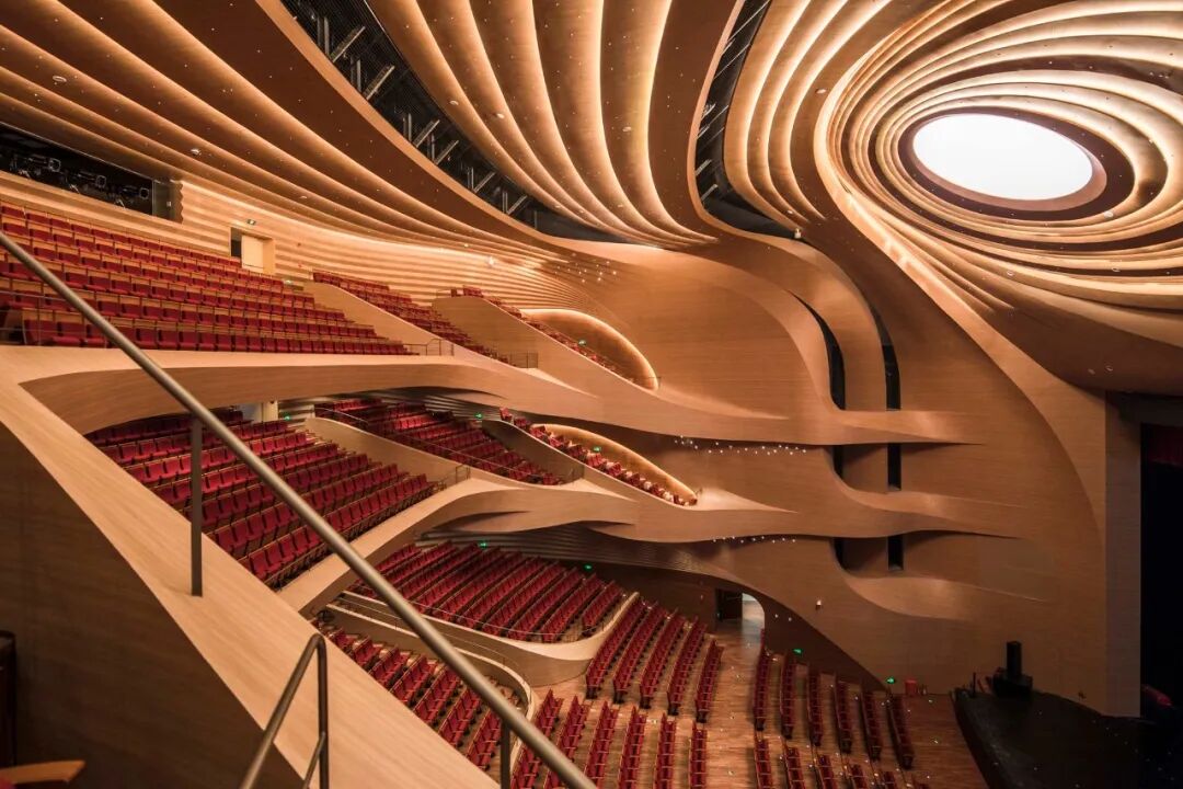 1600-seat grand theater: The auditorium is a classic horseshoe theatre built for opera and ballet. It houses approx 1600 visitors in three layers. The whole space seems to be wrapped around by petals. All the lights and audio equipment are well hidden between petals and can be flexibly adjusted according to the needs of the performance.