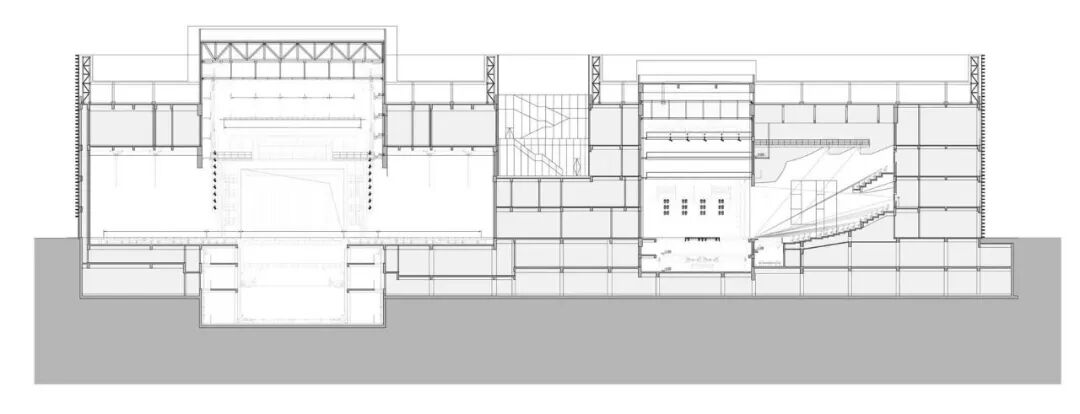 300个座位的多功能厅:扬州之秋以银杏为美。多功能厅墙面深浅不一的吸音模块如同纷纷落下的银杏叶,勾勒出鳞次栉比的古城剪影。多功能厅空间为黑匣子模式,配备活动的看台,舞台和灯光设备。