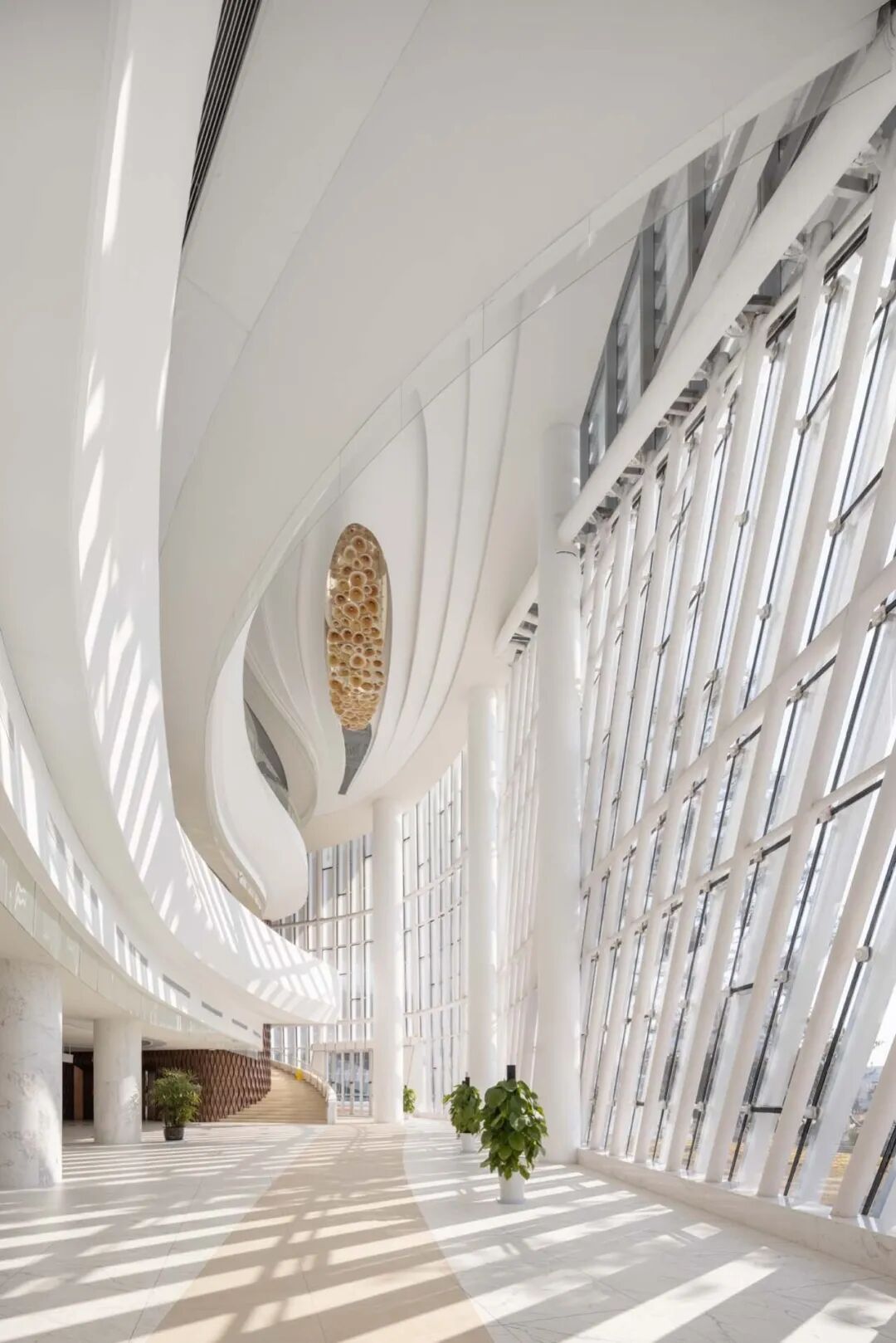 Lobby in the air: The east and west buildings are connected on the 5th floor by a 50m long sky corridor. It serves as a public and multifunctional lobby with a panoramic view of Moon Lake and the city. The water wave pattern on the ceiling fits the shape of the structural truss and makes the space fluid and light.