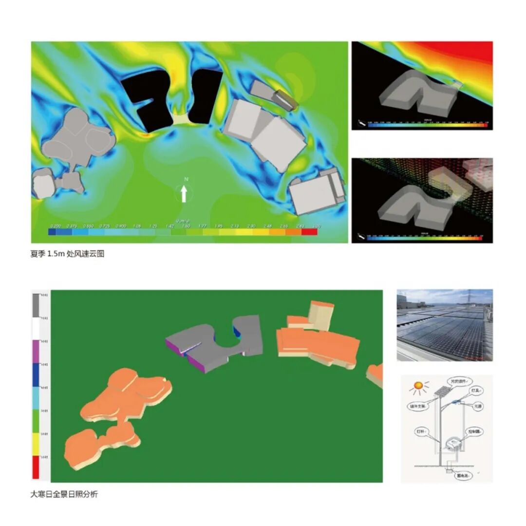 通过内院引入夏季舒适的自然风,结合适应扬州气候和土壤条件的绿植,为室外活动营造了舒适的环境。日照模拟显示大剧院全年均沐浴在充足的阳光下,由此可最大限度的利用太阳能光伏发电。立面的水平石材和竖向百叶均可形成有效的遮阳,并鼓励自然通风。