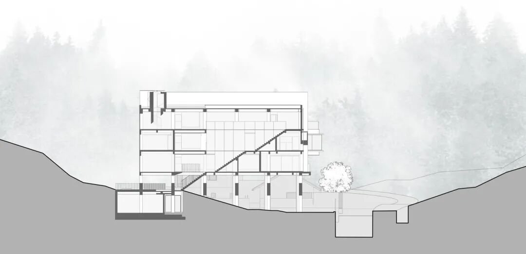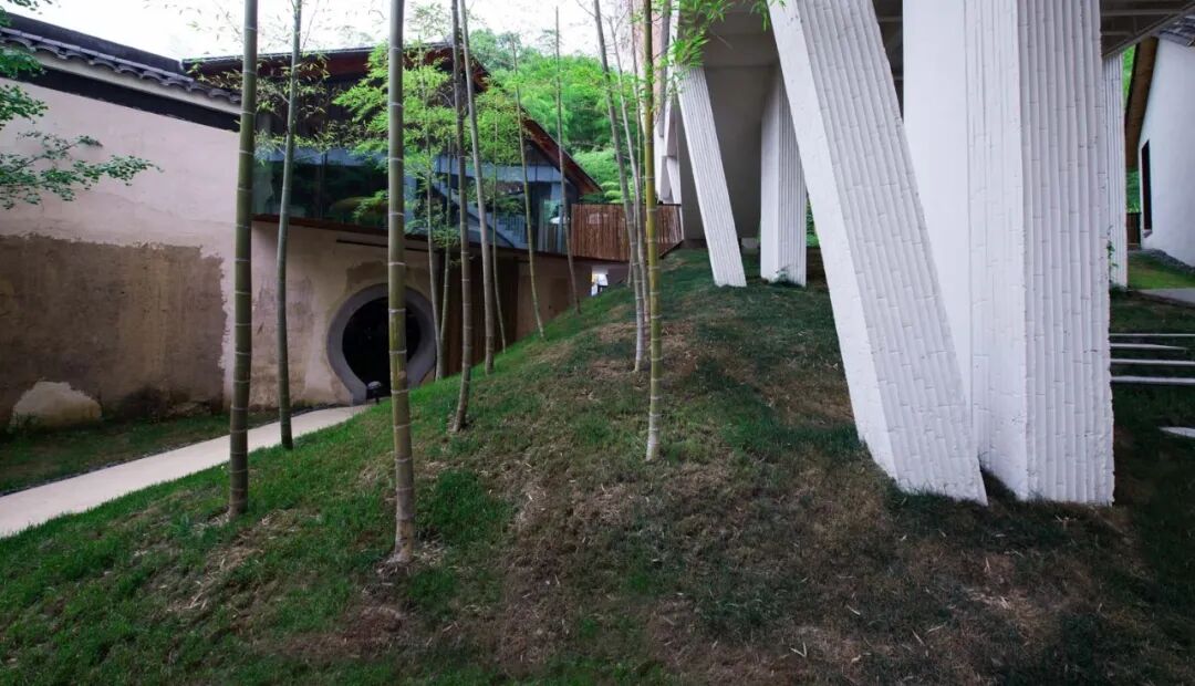 老宅、新房、山林在架空层里交叠,围合出有趣的灰空间;场地通过自然化的草坡与原有的山林紧密相连,也顺势将后山的景致揽入其中。