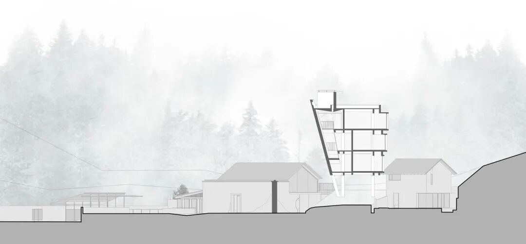 一面微斜的墙体似从草坡上长出,村庄与山林在此过渡;整体空间被一分为二,一半用于公共活动,一半用于居住;行走于场地中的人们,随着视线的变化形成两种截然不同的感受。