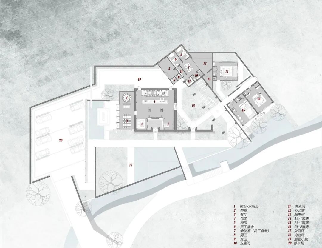 停车场一侧的主入口,毛石墙、竹亭、建筑、远山顺应地形的变化形成简洁而不失张力的构图;不想过多地营造“领域感”,只希望人们在行进的过程中感受到些许心境的放松。