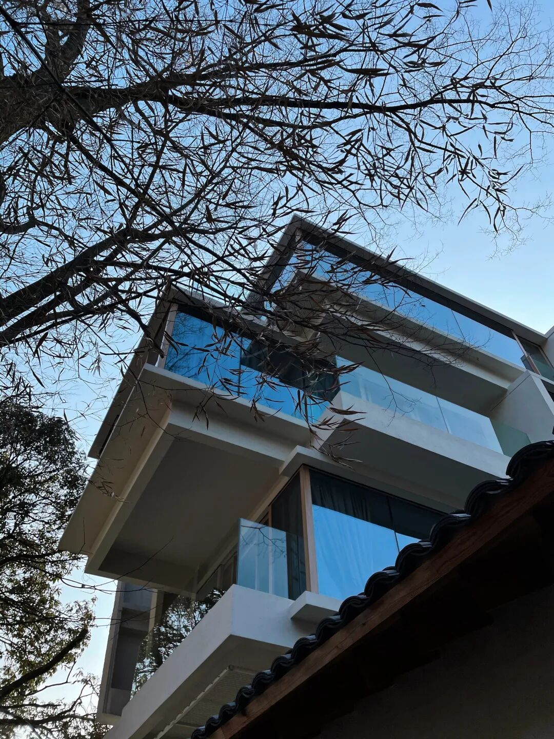 不同的体块之间有序错动、交叠,积极地回应周边环境和视野的变化;大面积的落地窗将景观引入室内,也映衬出天空和山林变幻的颜色。