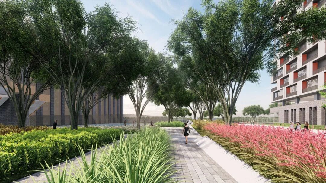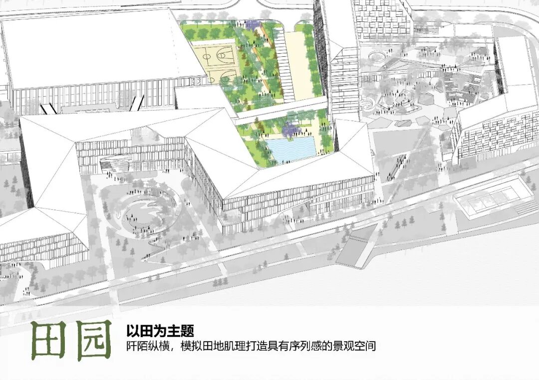 围绕着中心交通系统,“山”“水”“林”“田”“居”等不同主题的园林都经过了精心设计,呼应师生的学习和生活氛围。