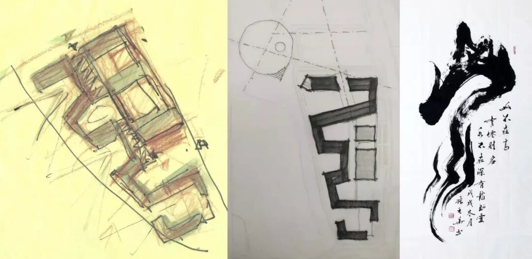 因此,在延续校园整体连续流畅的规划布局基础上,设计团队从书法作品中汲取灵感,把江南山水蜿蜒写意的特点和理工科院校严谨工整的精神相结合,呈现出一个具有两副面孔,而又抑扬顿挫、行云流水的整体建筑布局。
