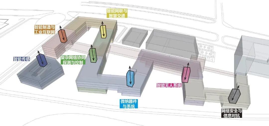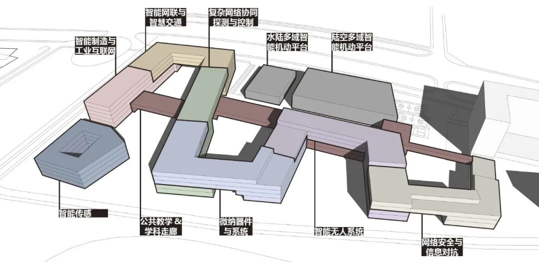 在本建筑组团的设计中,建筑师并不是一味自我满足地追求形态上的美观,而是仔细研究和打磨了建筑的交通和功能结构。在长条形的连续的形体中,设计师按照功能面积划分各创新研究中心,并将公共教学轴南北贯穿其中,东侧靠近东方北路则布置了两个大空间机动平台。