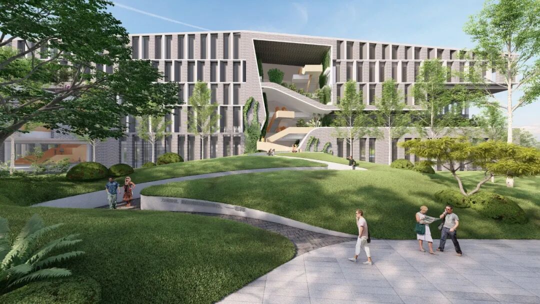 南研究中心和南生活区位于城市道路和校园内部景观湖中间,一边是秩序井然的人工设施,一边是天造地化的自然环境。建筑师的灵感便来源于这两种截然不同的氛围之中——创造一个过渡的建筑环境,让自然与人工的相遇变得更加柔和,让建筑群体更加自然地坐落其间。