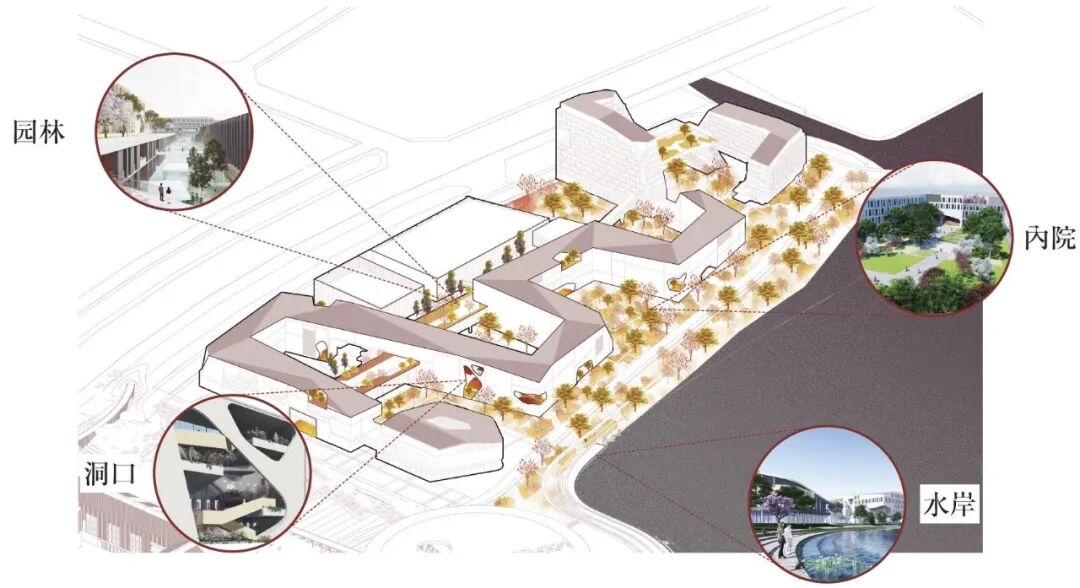 设计团队以一条折叠的超长线型体量作为骨架,并用一条公共廊串联南北,围合出多层次的合院,承接城市环境及滨水景观。