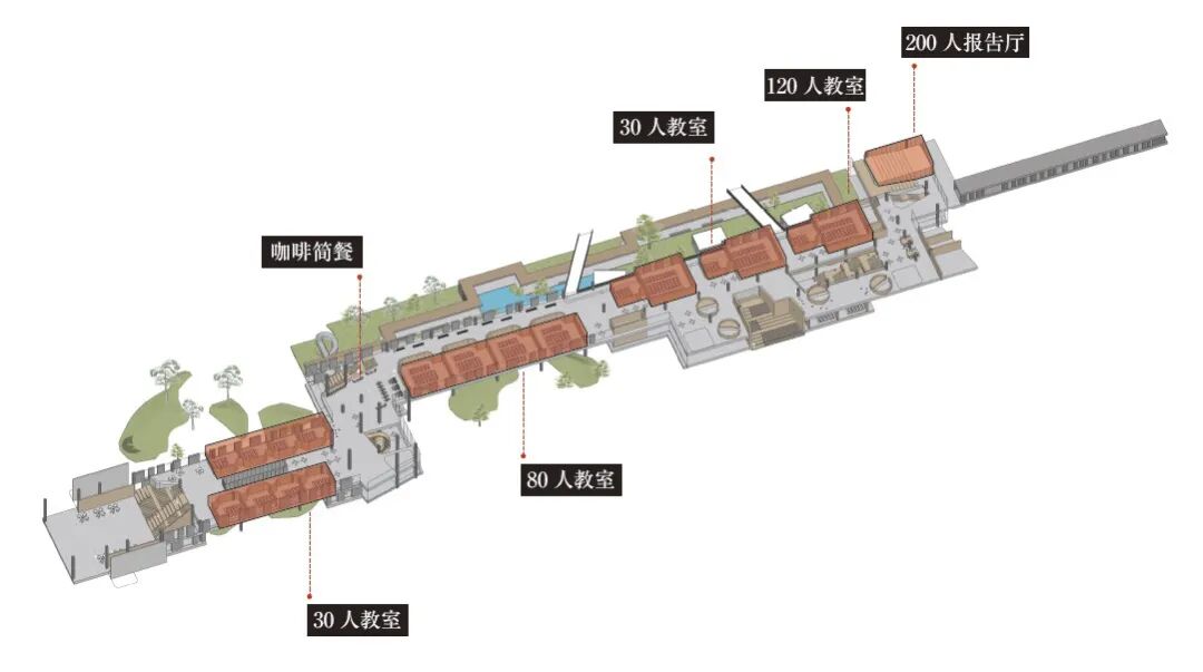 贯穿整个建筑群体的公共连廊串联各个研究中心,创造了沟通学习区和生活区的步行流线,其中还包含有公共教学和日常服务学生的咖啡简餐等功能。