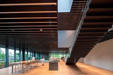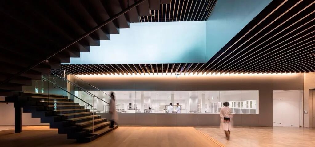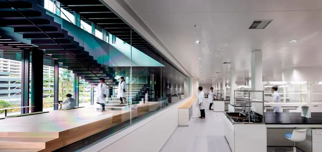 根据研究领域划分的办公室和实验室功能,现在被共享,从而创造出一个超越各自边界的创造性环境。场地的入口一侧设置为一个开放的空间,有郁郁葱葱的绿色植物,景观的天花板反射作为建筑和城市之间的接口。其目的是创建一个与当地社区“共存”的设施。