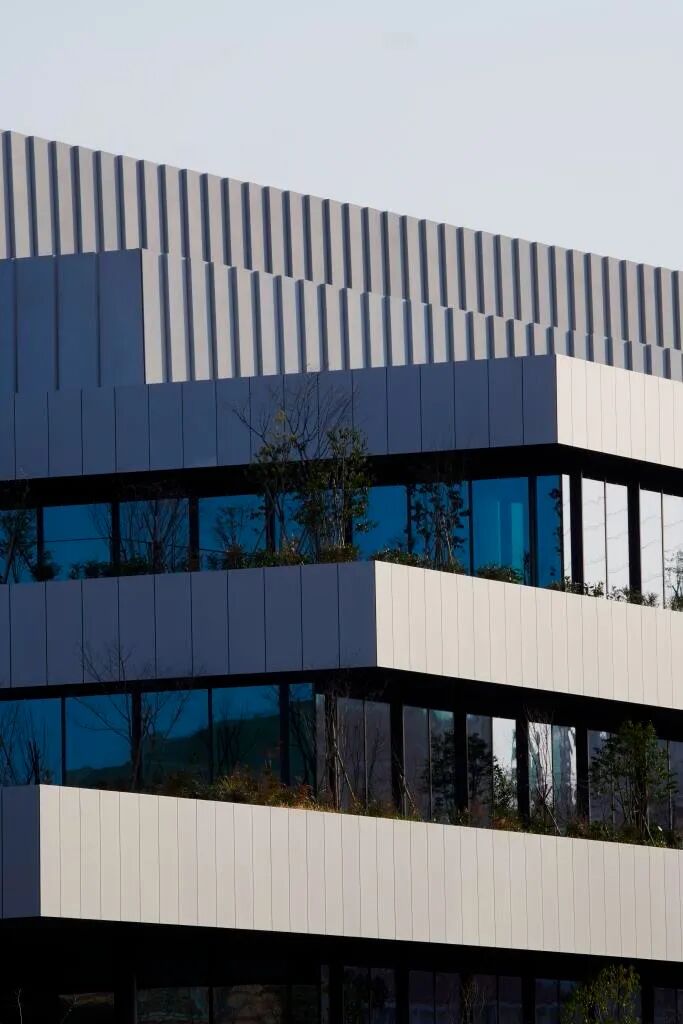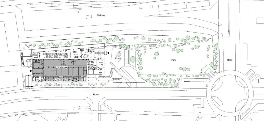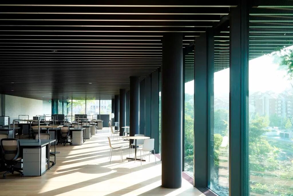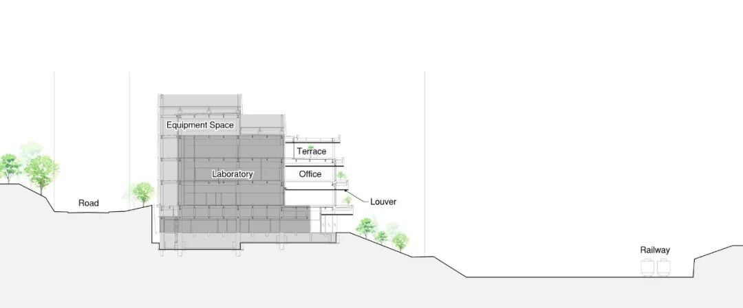 另一方面,办公区域被设计成一个单一的共享空间,便于研究人员之间的交流。通过将办公区域设置在京应线的北侧,确保了沿线丰富的城市景观,以及稳定的北侧照明。办公区域周边的阳台和露台被用来种植这些植被,而不是种植室内树木来对付昆虫,改善了室内景观。这种布局也创造了一个与周围城市景观高度兼容的外部形象。