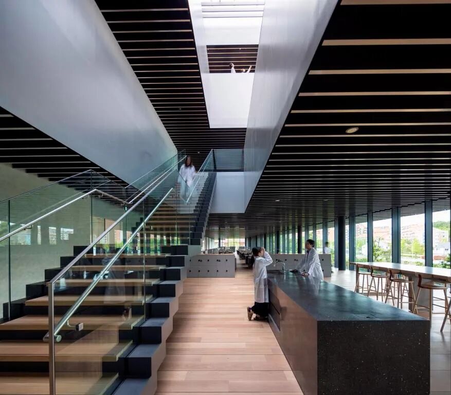 通过“线性分区”创造一个舒适的工作场所。办公室、实验室和设备竖井的区域清晰地划分在狭长的建筑中。这导致了一个相对“浅”的办公区靠近外部环境,一个实验室区靠近设备竖井,提供了高度的灵活性。
