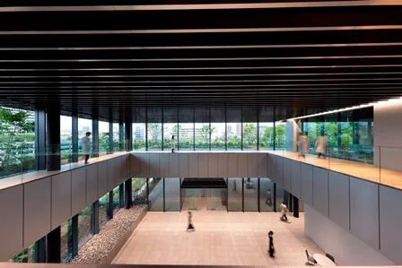 Glare-free mirrored aluminum louver ceiling creates interior-exterior continuity. In keeping with the theme of "openness", an aluminum louvered ceiling with a mirrored underside motif was designed to create a sense of continuity between interior and exterior spaces. The blacktop and sides and electropolished underside create a surface that reflects the environment. Depending on the observer’s position and orientation, the exterior planted greenery, the interior space and the images of the bustling city seem to shift. In order to create a thoroughly mirrored surface, all obstructions were removed. The height of the equipment installed between the louvers was raised as high as possible above the underside, with downlights used to avoid scalloping and glare. The louvers were designed with a mountain-like 0.8mm shape so that downlight illumination would not be reflected on the sides of the louvers.