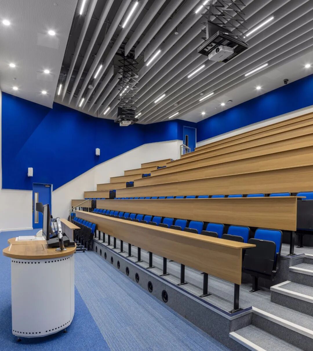 A clear entrance to the building is marked by a double-height atrium. The collaborative spaces of Central Quad are designed to bring together cross-disciplinary groups, both formally and informally to promote new synergies and interdisciplinary research projects. Sharing ideas and techniques is at the heart of the atrium’s planned programme of student expositions. Substantial breakout areas on every level provide spaces where students, staff and researchers can gather in small groups, encouraging accidental meetings and serendipitous conversations.