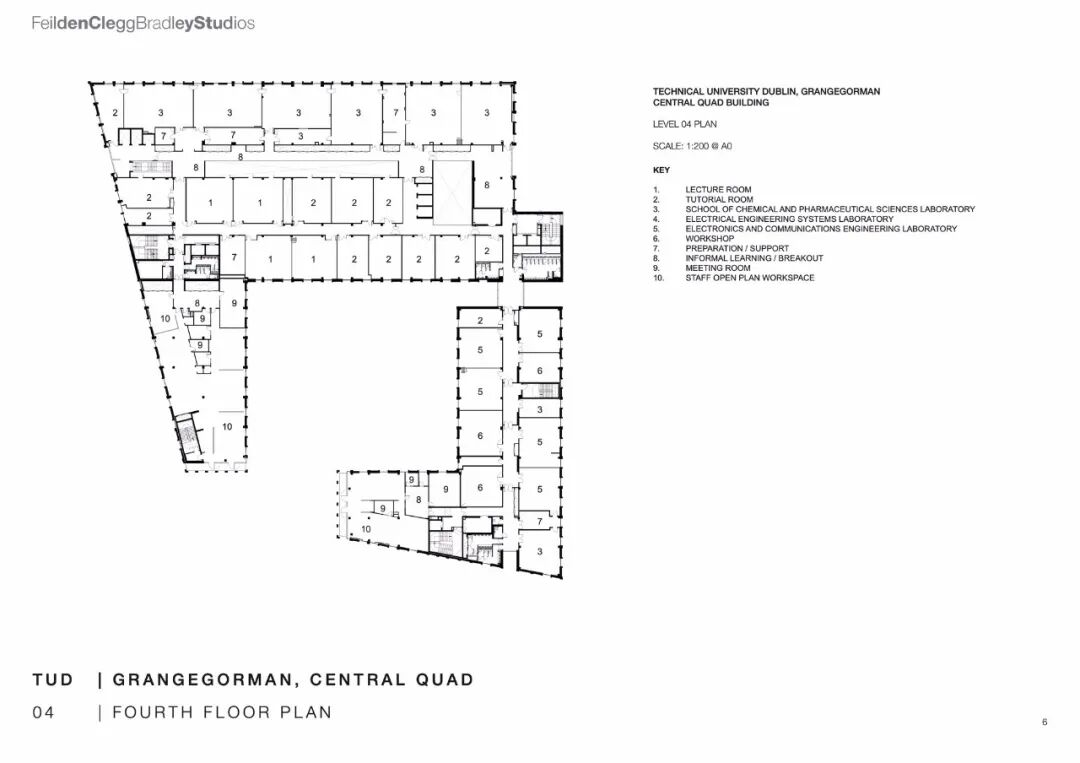 Central Quad is a 35,000m2 interdisciplinary teaching building for the TU Dublin Grangegorman Campus. Science, research, and innovation-focussed, it accommodates ten schools from the College of Sciences & Health, College of Engineering & Built Environment, and College of Arts & Tourism. Central Quad is home to 6,500 students and 400 staff and provides flexible and specialist accommodation alongside general learning space, distributed learning commons, staff accommodation, and building support.