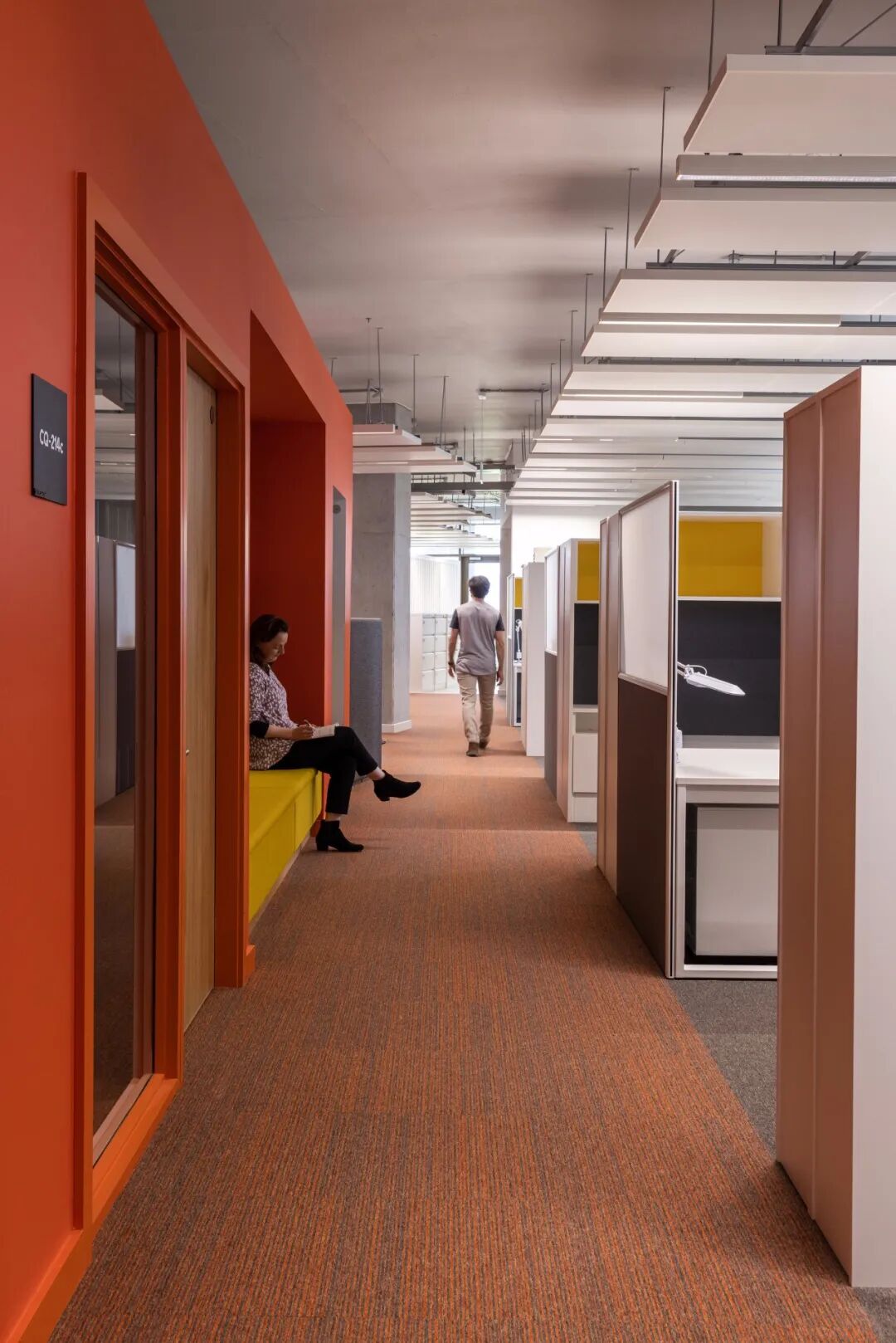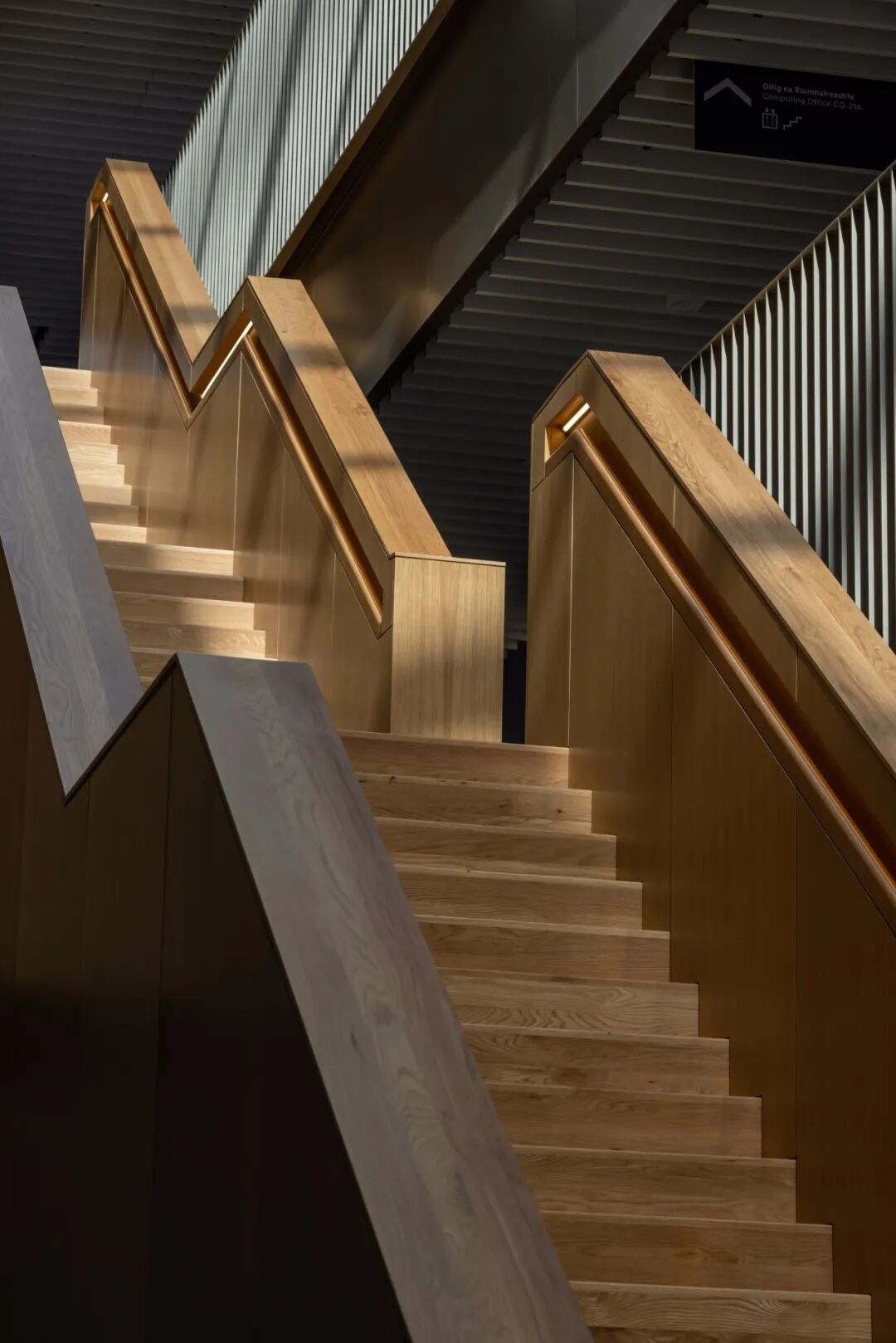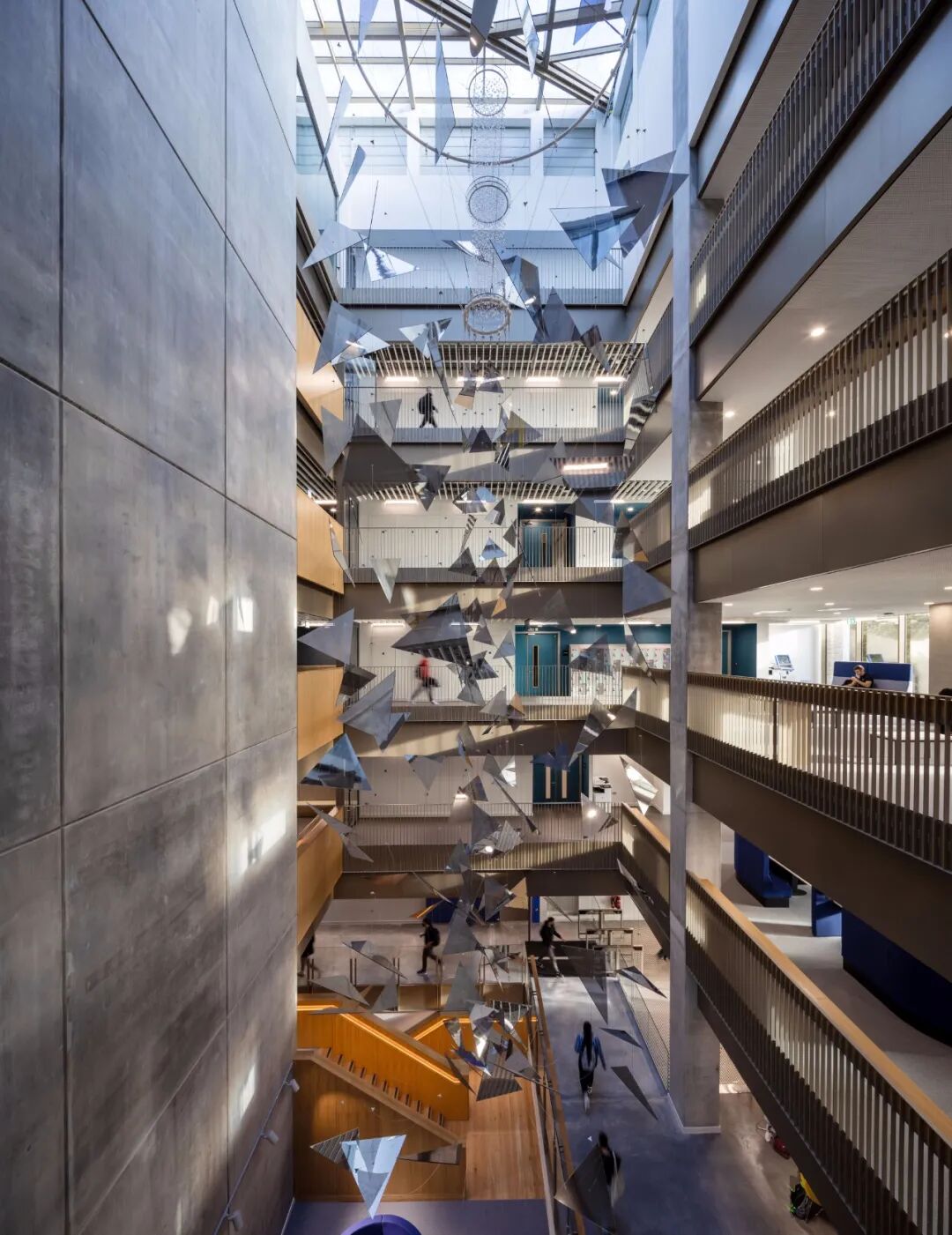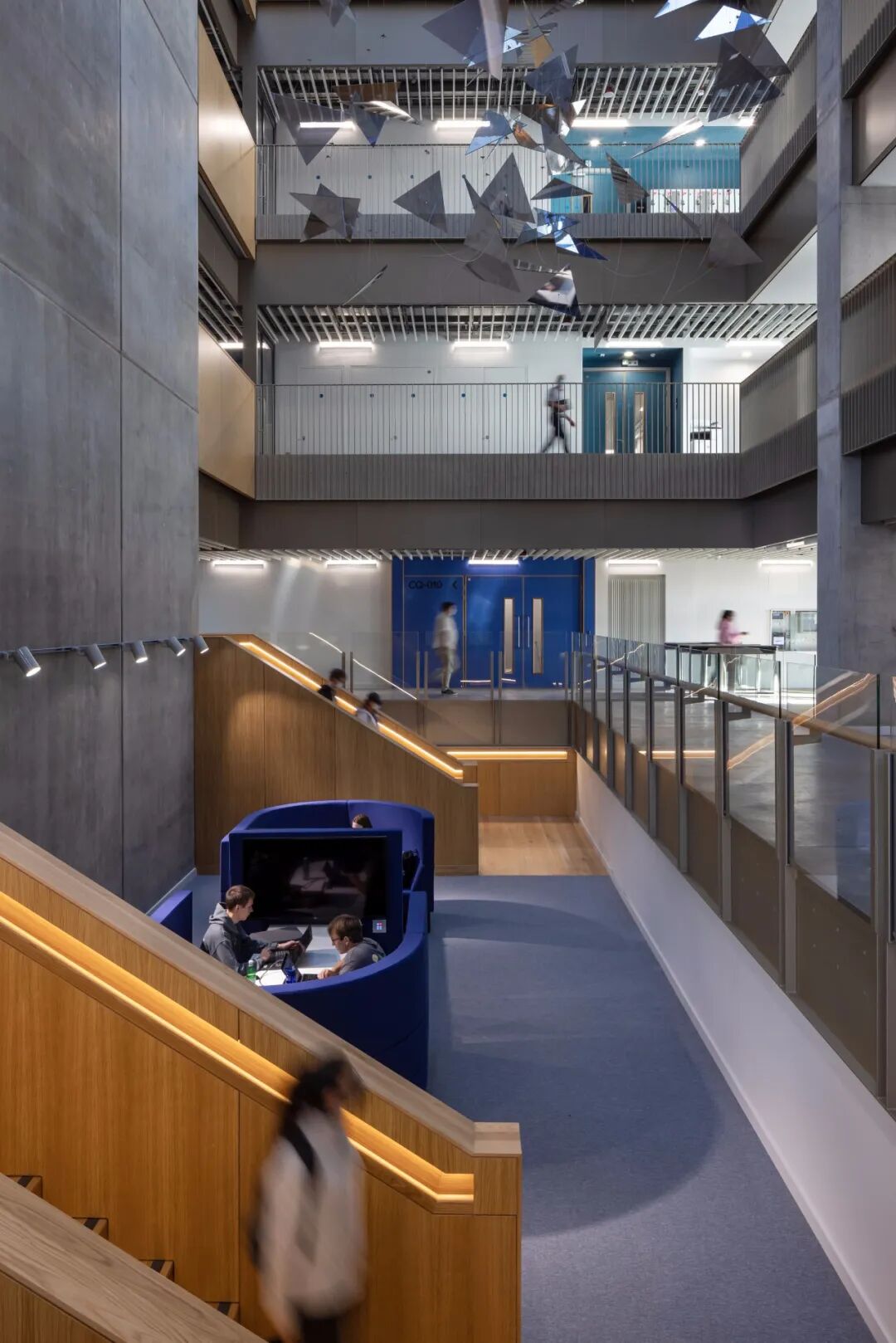 一个通高的中庭标志着建筑的清晰入口。中央广场的协作空间旨在将跨学科小组聚集在一起,正式和非正式地促进新的协作和跨学科研究项目。分享思想和技术是中庭学生展览计划的核心。每一层都有大量的空间,学生、工作人员和研究人员可以聚集在一起,鼓励偶然的会面和偶然的对话。