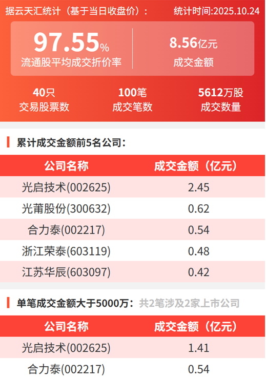 2025年10月24日,大宗交易成交金额8.56亿元,交易股票数40只,成交笔数100笔,流通股平均成交折价率97.55%,成交数量0.56亿股。