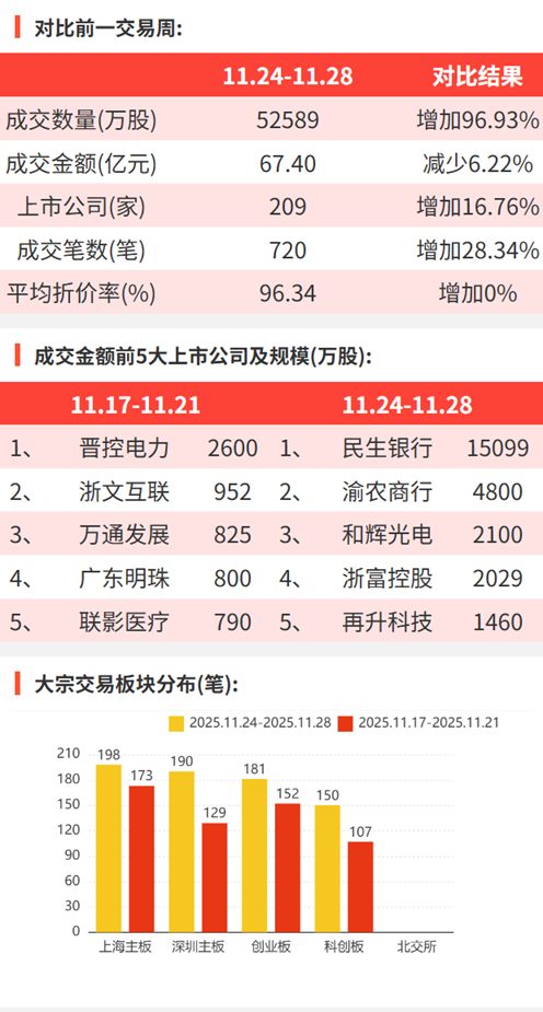 2025年11月24日至2025年11月28日,大宗交易成交金额67.40亿元,交易股票数209只,成交笔数720笔,平均成交折价率为96.34%,成交数量5.26亿股。