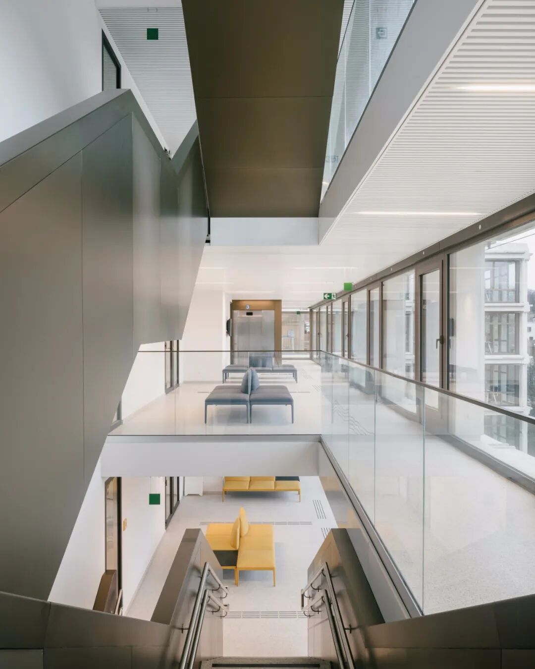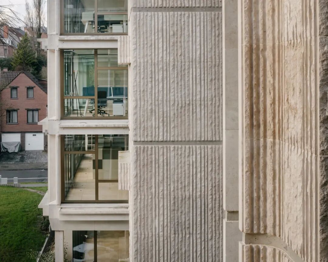干预是微妙的,同时创造了一个现代的建筑。建筑结构的严谨表达被保留下来。不同的窗户图案在楼层之间建立了一种联系,并提供了一种更轻松的立面解读。在供暖和制冷方面,我们与布鲁塞尔的公共配水商Vivaqua合作开发了一个试点项目,该项目使用RioTherma:从废水中提取的能源,最佳利用现有能源流和现场的特定当地条件。