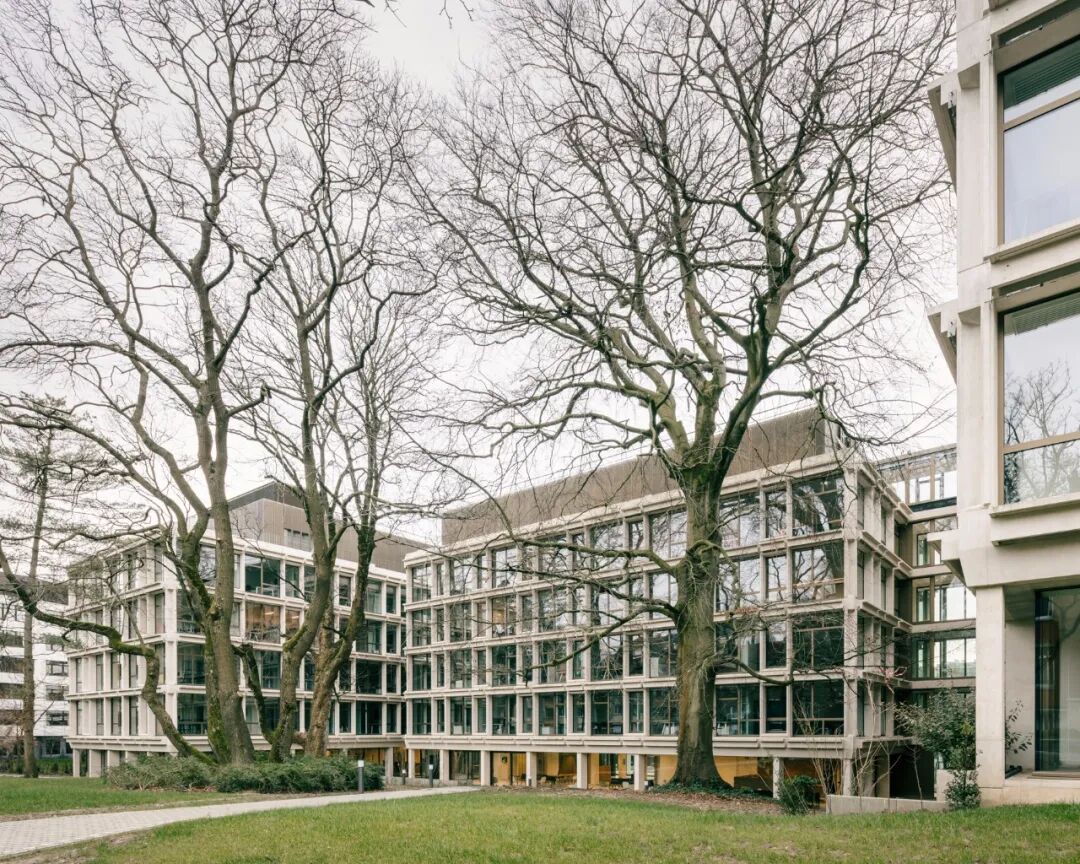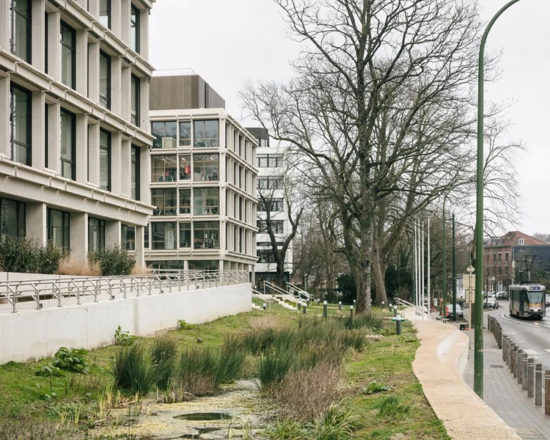 The architectural interventions are subtle and respectful while creating a contemporary identity. The rigorous expression of the building’s structure is preserved. Different window patterns create a link between the floor levels and offer a lighter reading of the façade. For heating and cooling, we have developed with Vivaqua, the public distributor of water in Brussels, a pilot project that uses riothermia: energy derived from wastewater, optimally utilizing existing energy flows and the specific local conditions of the site.