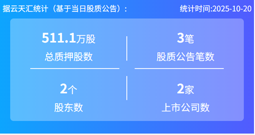 2025年10月20日,股票质押总质押股数511.1万股,上市公司数2家,股质公告笔数3笔,股东数2个。
