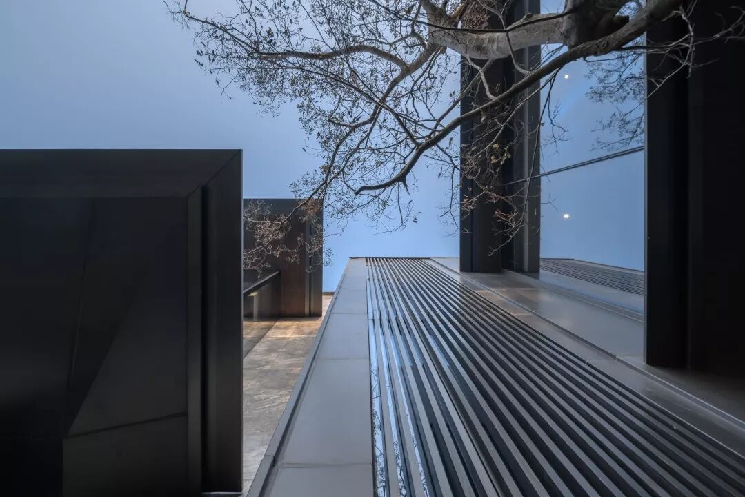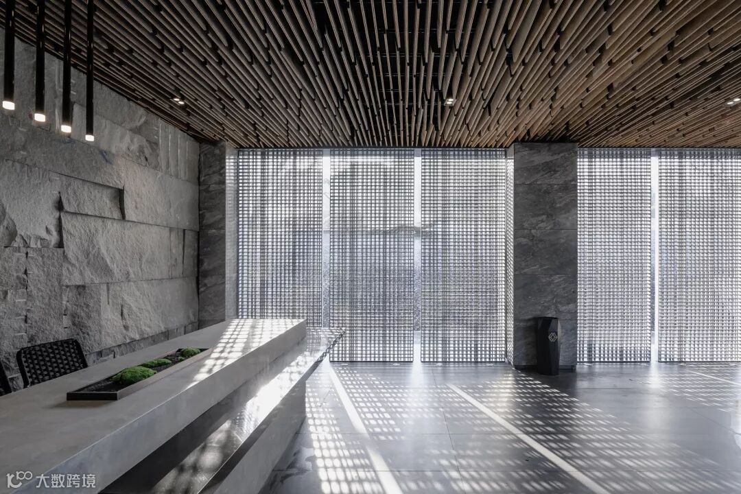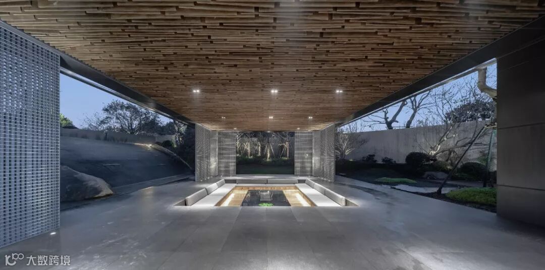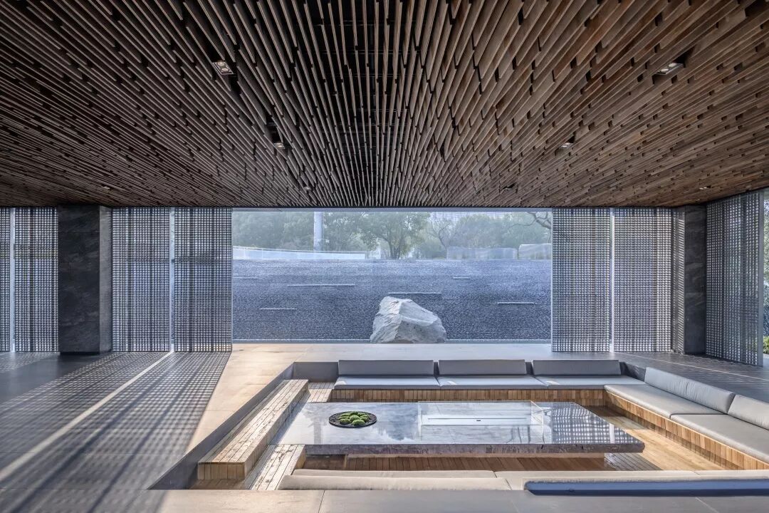 顺势而下,映入眼帘的便是水涧青石般的园林庭院。在跌落的水景和中部庭院之间,我们定制了一个独特的“奥空间”。玻璃与格栅的交织,最大限度的延展视线,造园之意在于融景寓情。在这里既可以驻足停留,也可以休憩静待。