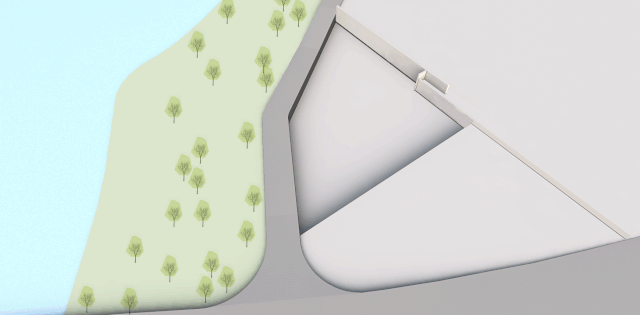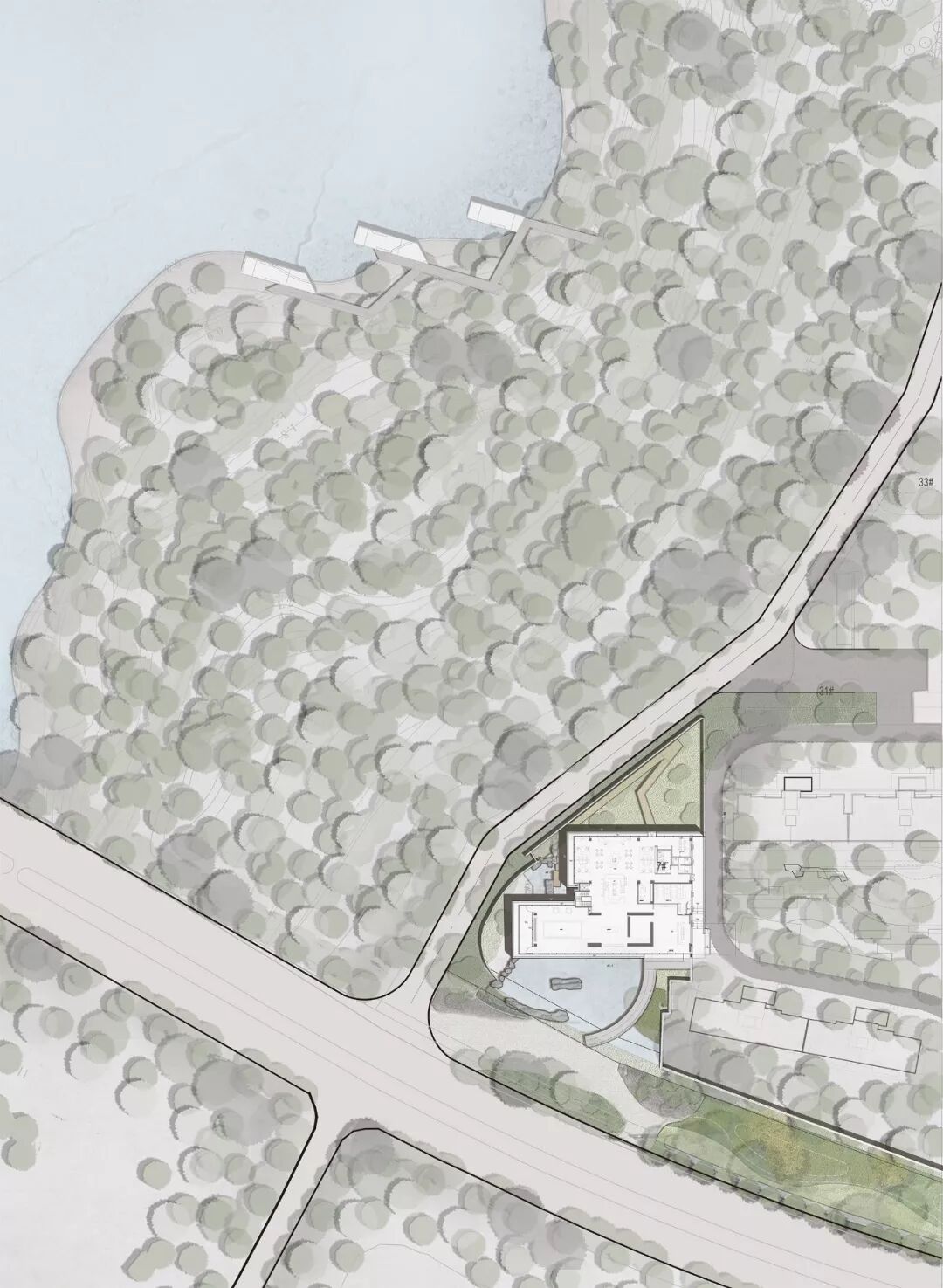 通过跨专业间的反复推敲,我们重新规整场地布局,积极利用基地西南角的城市道路和湿地之间的三角形用地,使建筑临于城市界面,在强化昭示感的同时与自然产生对话。