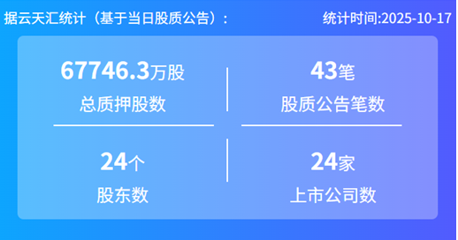 2025年10月17日,股票质押总质押股数6.77亿股,上市公司数24家,股质公告笔数43笔,股东数24个。