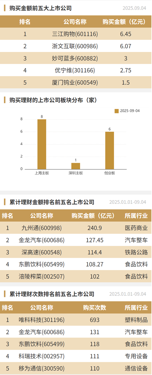 2025年9月4日,上市公司购买理财金额26.77亿元,共18家上市公司,理财产品43个。