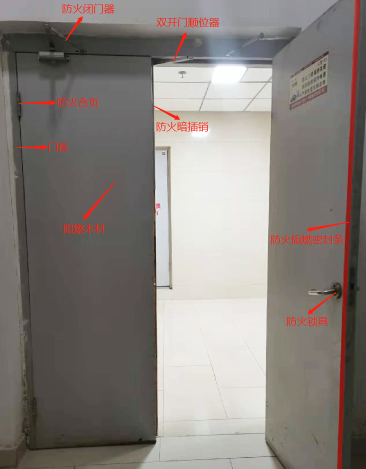 双扇防火门通过安装顺位器顺序器,保证左边防火门能先行关闭,右边防火门随后关闭,双扇防火门才能确实有效隔阻烟火。