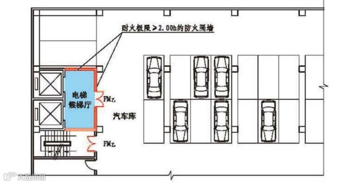 5.5.6 直通建筑内附设汽车库的电梯,应在汽车库部分设置电梯候梯厅,并应采用耐火极限不低于2.00h 的防火隔墙和乙级防火门与汽车库分隔。
