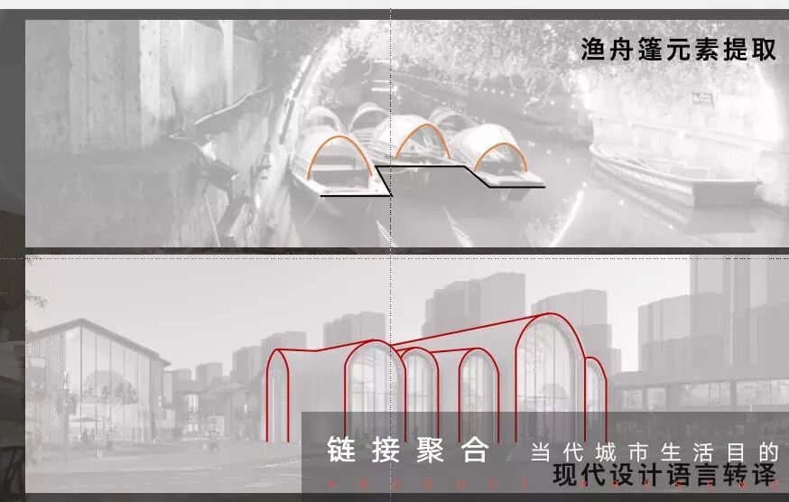 在园林景观上,运用现代设计手法,将绍兴传统水街文化元素融入其中,打造扬帆起航,千帆过境,泛舟而渔民,渔人码头等IP记忆点。
