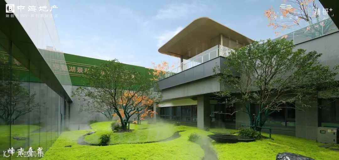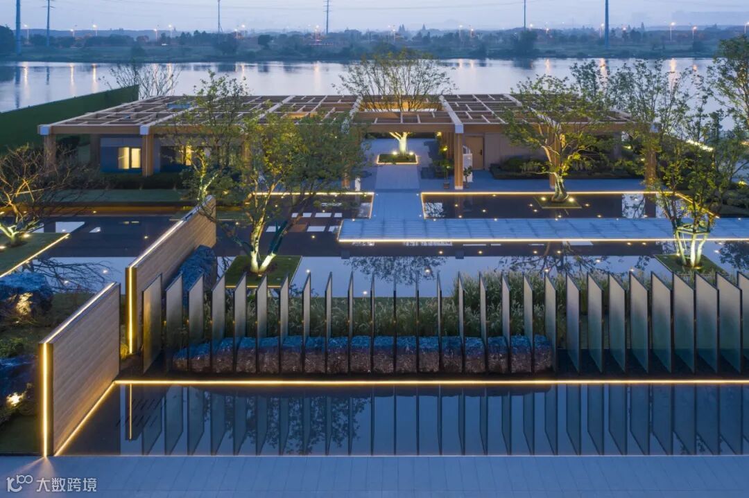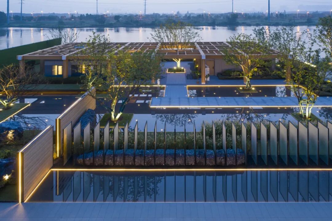 元垄·镜庐在景观设计上,以现代元素为主,融入本土文化,采用“一轴·两环·三礼八庭”的层次结构与布局,同时延续湖居的诗意生活气质。
