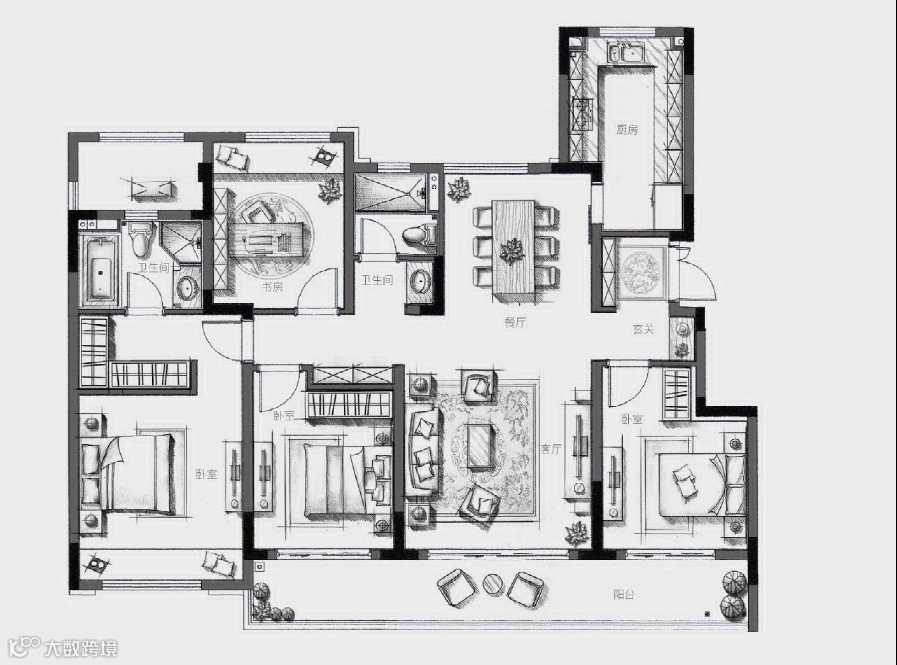 樾庭139㎡户型,规划四室两厅两卫设计,户型方正,做成了南北通透的全明户型。