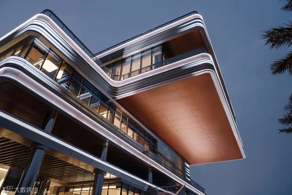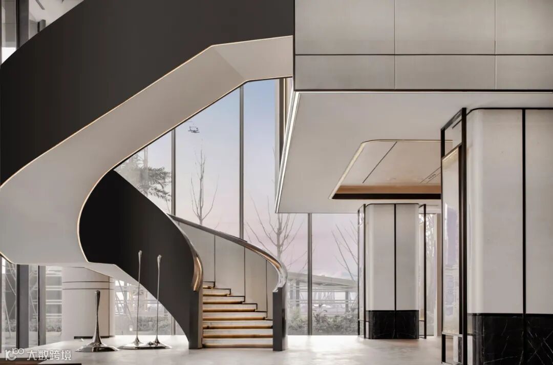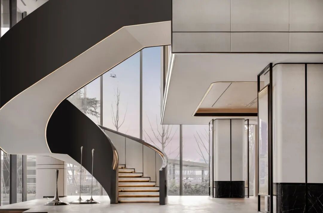 中海•铂隽建筑立面整体设计,承袭扎哈•哈迪德的流体美学,以奥体场馆为灵感,流畅弧面如曲水流动,曲线造型衍生变幻的光影空间。