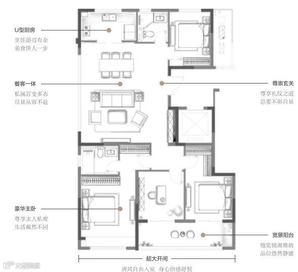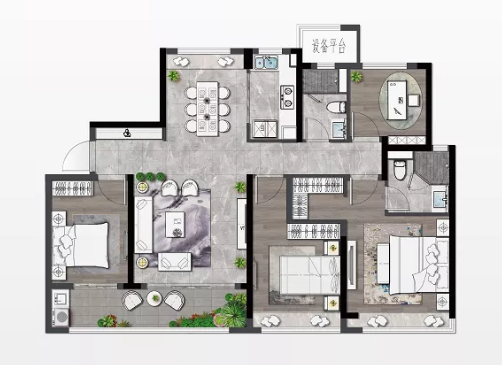 空间设计之上,超越10米的南向宽尺阳台,赏景、闲谈、阳光浴、使居者生活空间恣意延伸,与自然相映成趣!同时可根据需求划分生活晾晒与休闲区域,打造出理想居家生活环境。