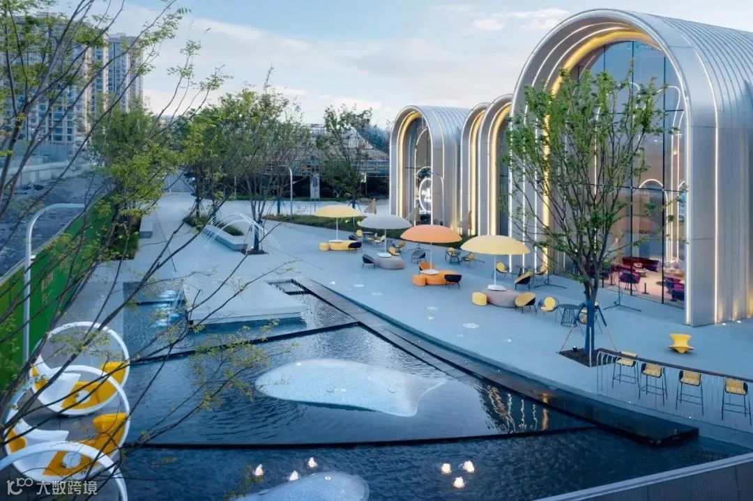 结合渔舟印记与船痕语言,在售楼中心前方打造挑高的码头概念,同时结合两侧波光喷泉,亲水水景中的脚踏车、跳跳泉与喷水鲸鱼互动装置,作为整个水街购物公园的活力起点。
