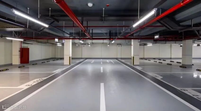 车位背面采用大面积瓷砖、装饰条,整体非常气派,流转艺术的气韵。地面用灰色环氧进行铺装,耐磨、持久、寿命长。
