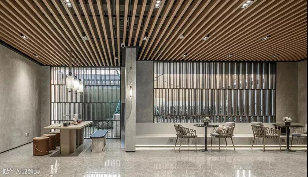 建筑设计延续绍兴则水牌——“水乡最后的渔村”的历史文脉,用现代设计语言浅灰石材、深灰格栅和极简壁灯的细节打磨,空间和氛围上回应对历史的雕刻。华灯初上,类比渔舟唱晚的孤灯斜影的氛围迎接归家人。